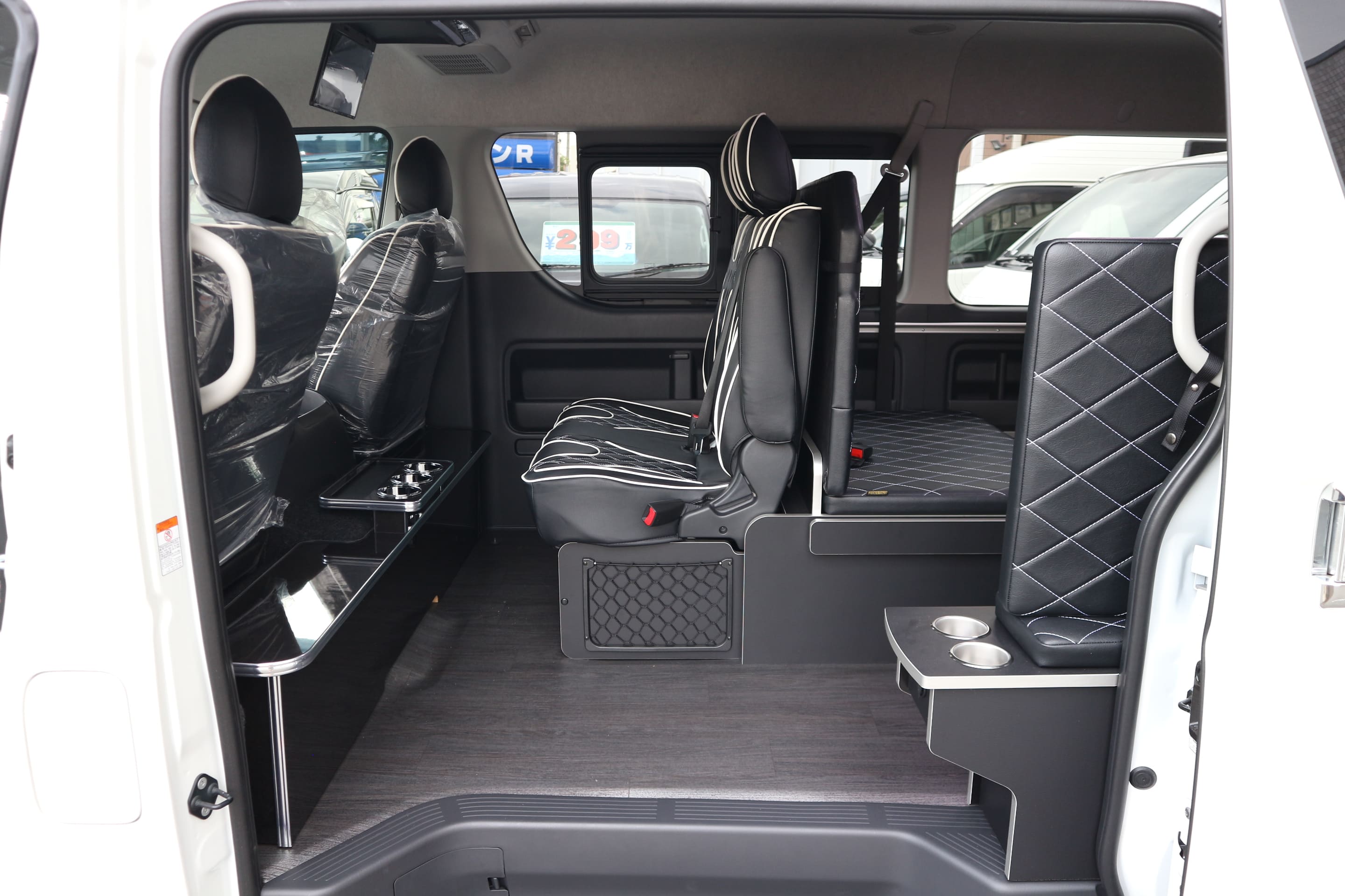 HOME > ギャラリー:IF-WB8 : ハイエースワゴンGL前向き8名後ろ向き2名10人乗り対面ラウンジベット家具 > IF-WB8 200系6型ハイエースワゴンGL ワイドボディー 前向き8名後ろ向き2名10人乗り対面ラウンジベッド家具施工