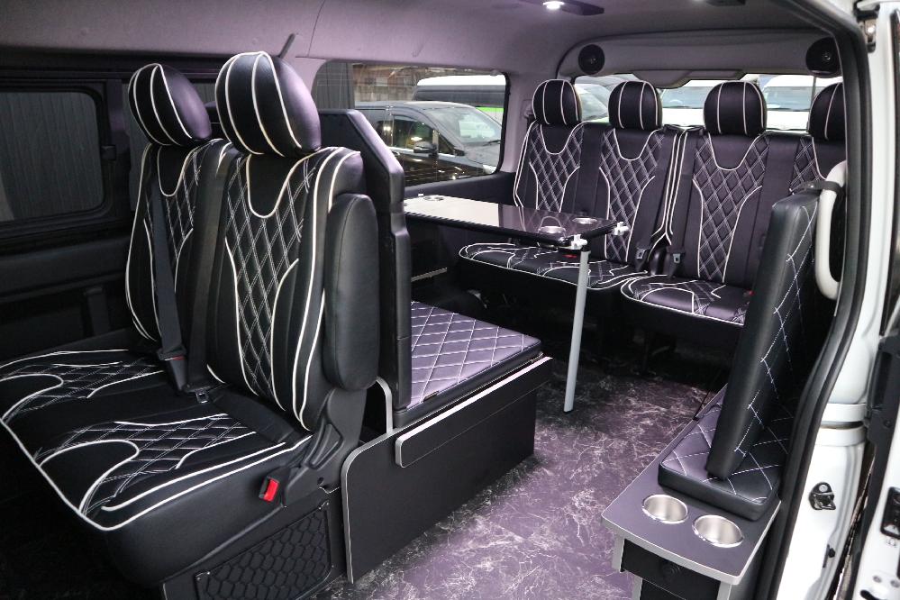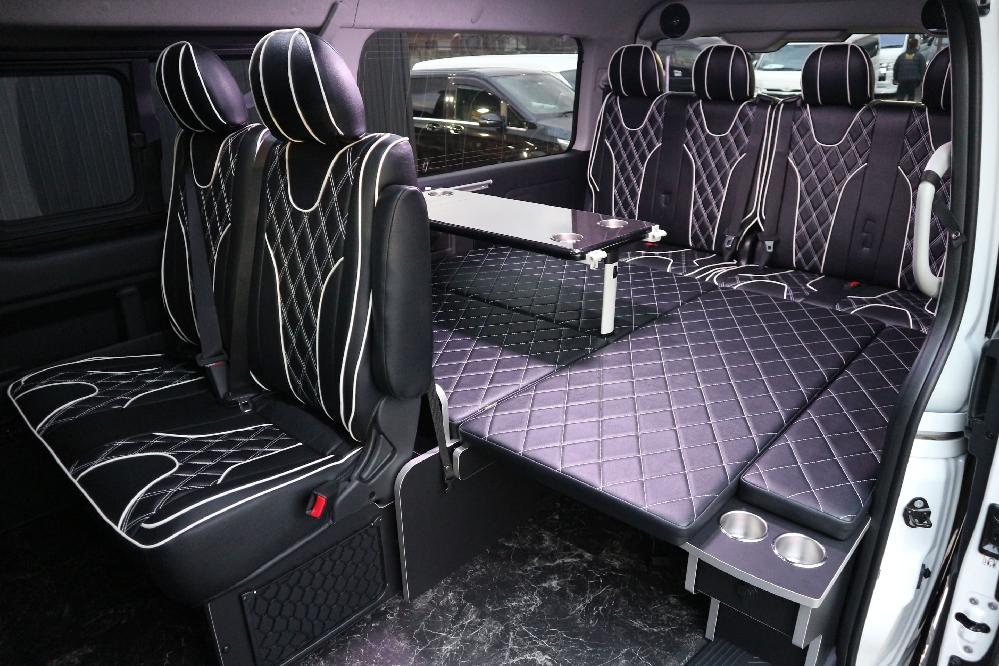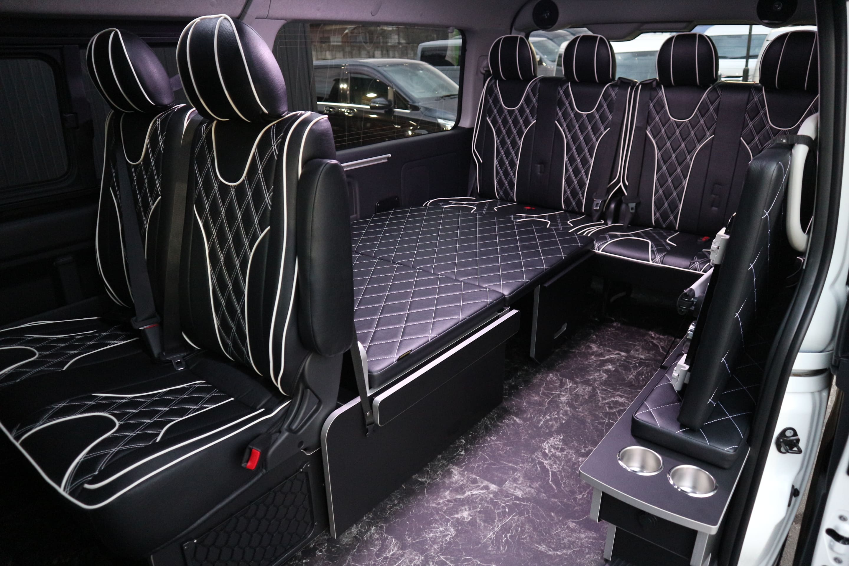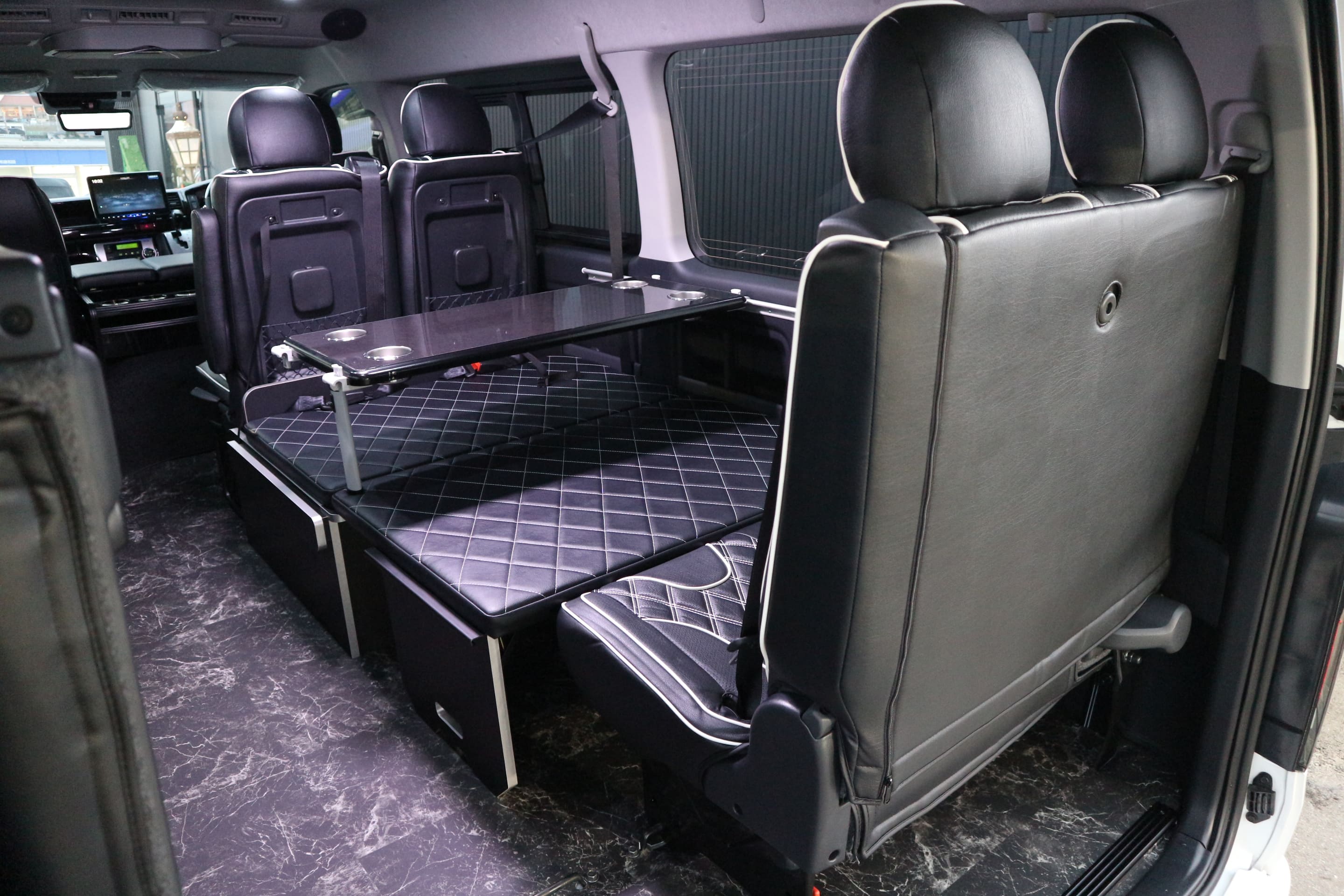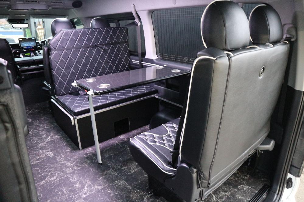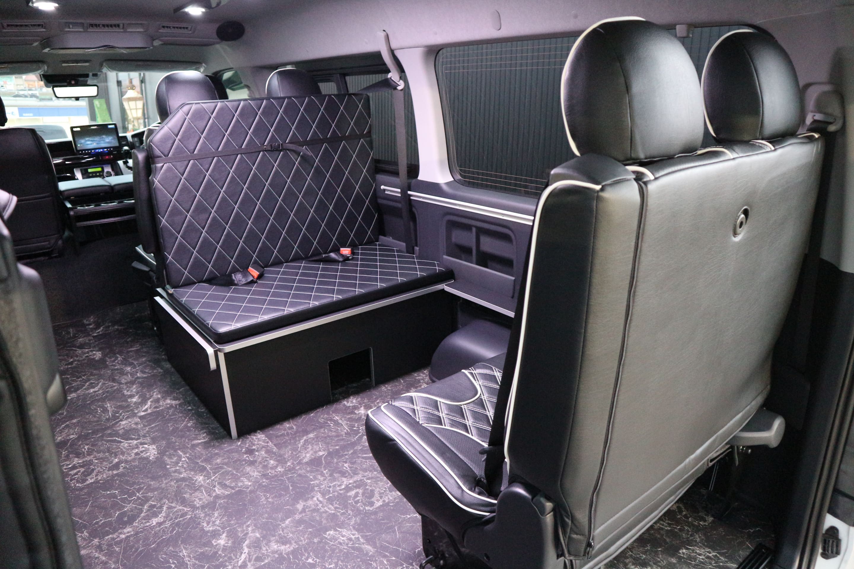 HOME > ギャラリー:IF-WB8 : ハイエースワゴンGL前向き8名後ろ向き2名10人乗り対面ラウンジベット家具 > IF-WB8 200系ハイエースワゴンGL ワイドボディー 前向き8名後ろ向き2名10人乗り対面ラウンジベッド家具施工