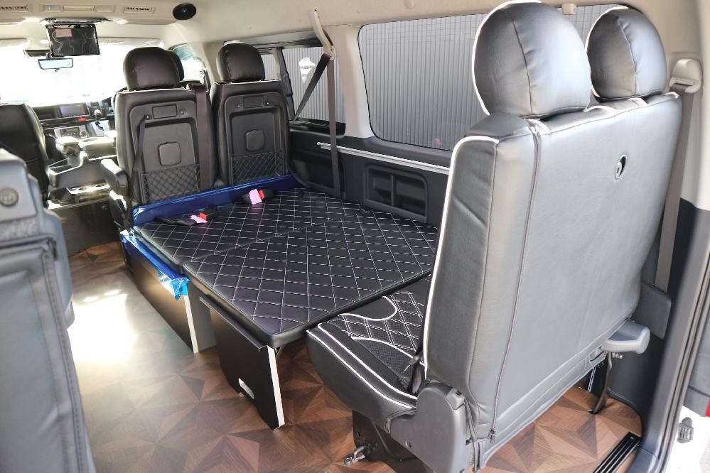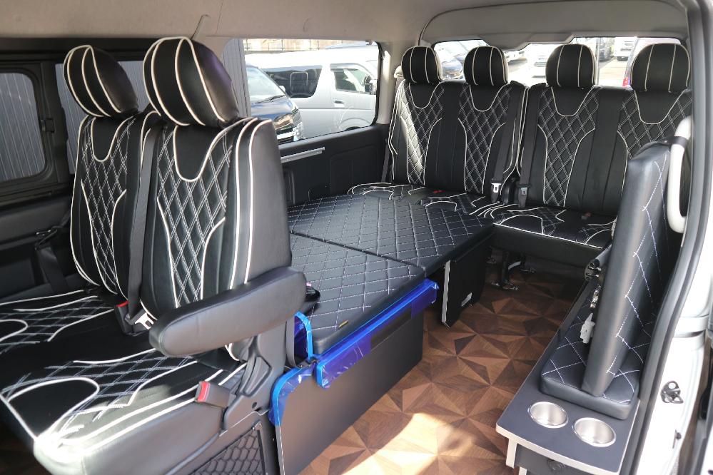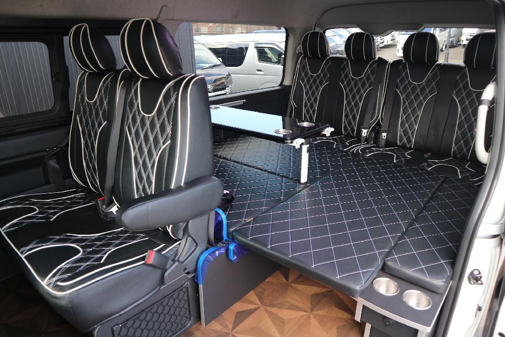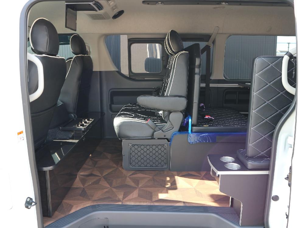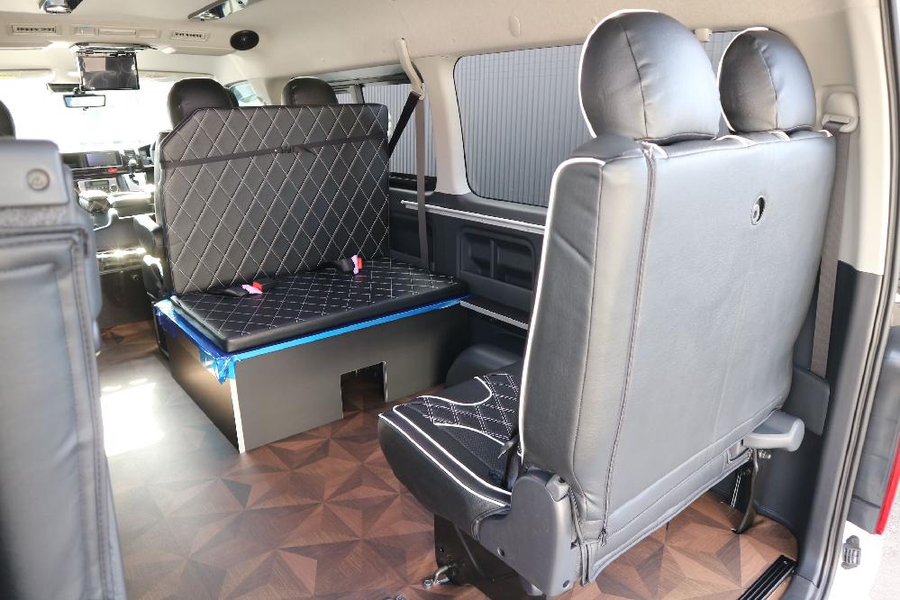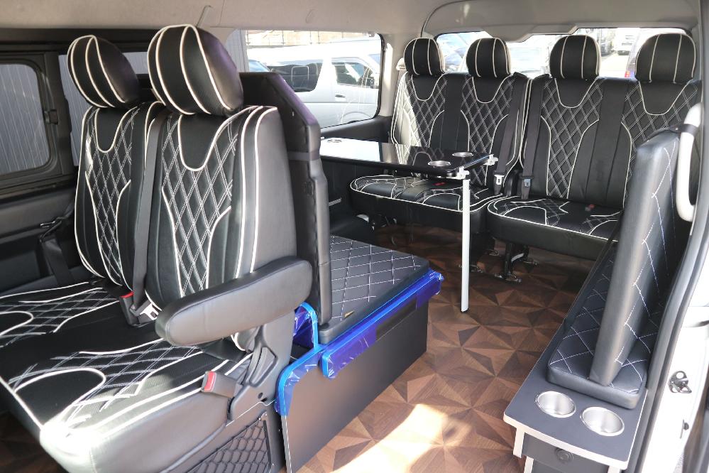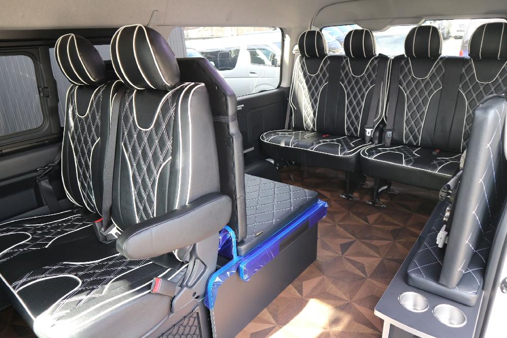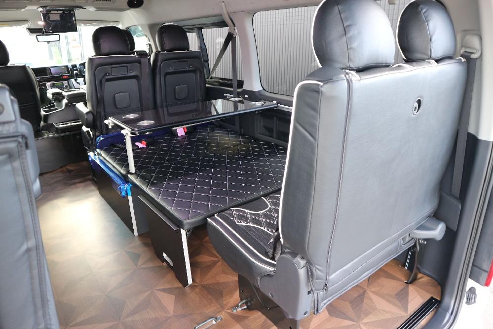 HOME > ギャラリー:IF-WB8 : ハイエースワゴンGL前向き8名後ろ向き2名10人乗り対面ラウンジベット家具 > IF-WB8 200系ハイエースワゴンGL ワイドボディー 前向き8名後ろ向き2名10人乗り対面ラウンジベッド家具施工