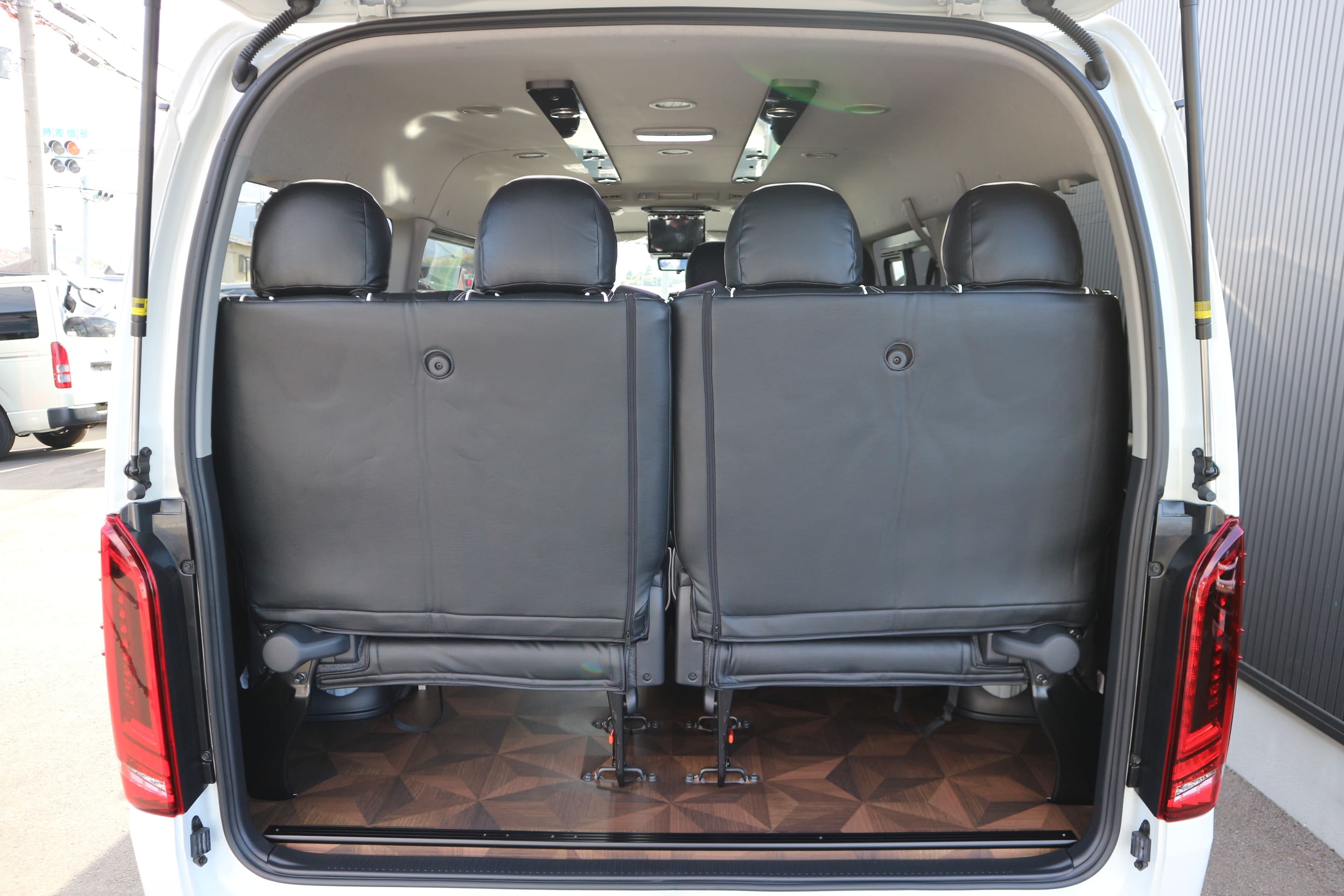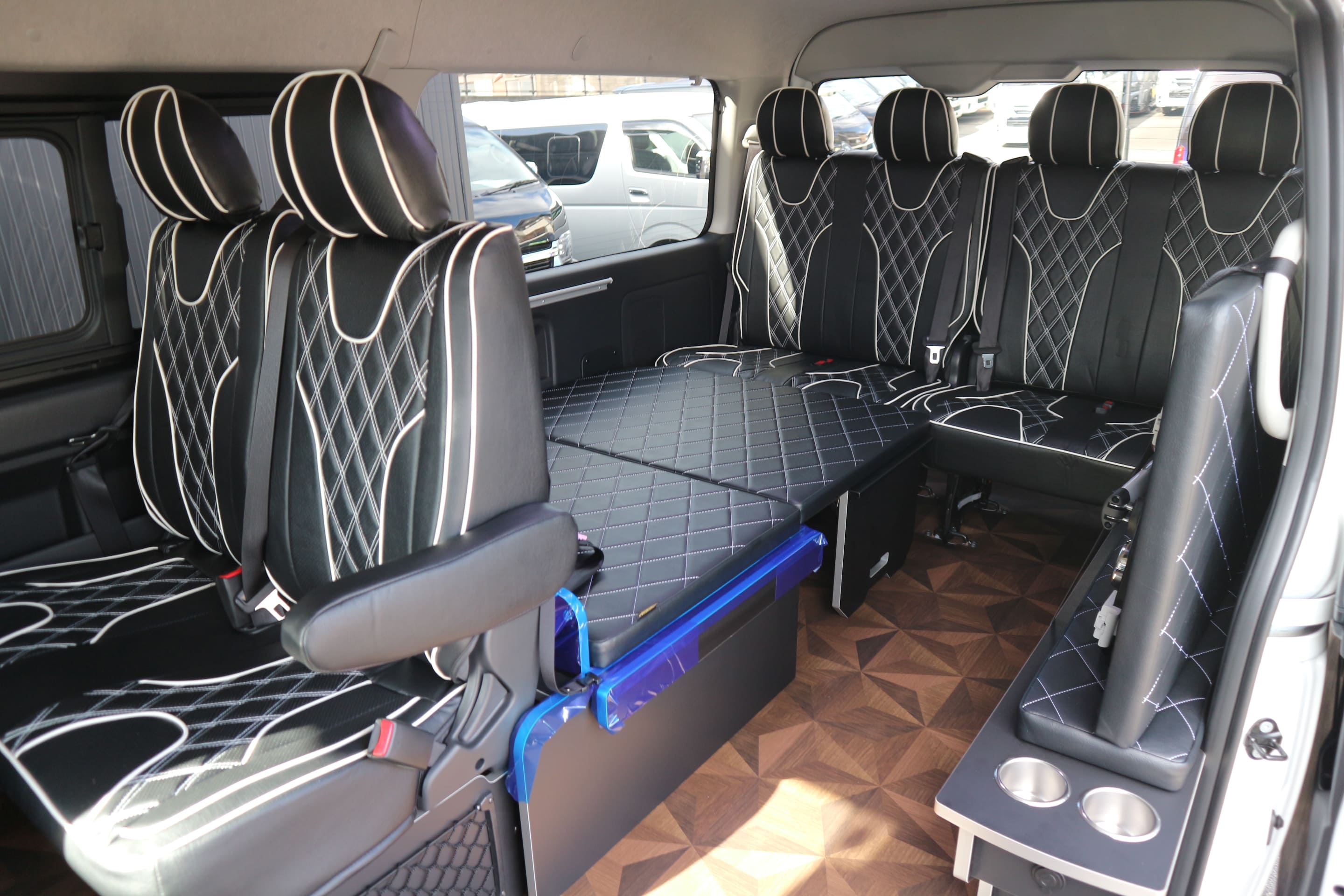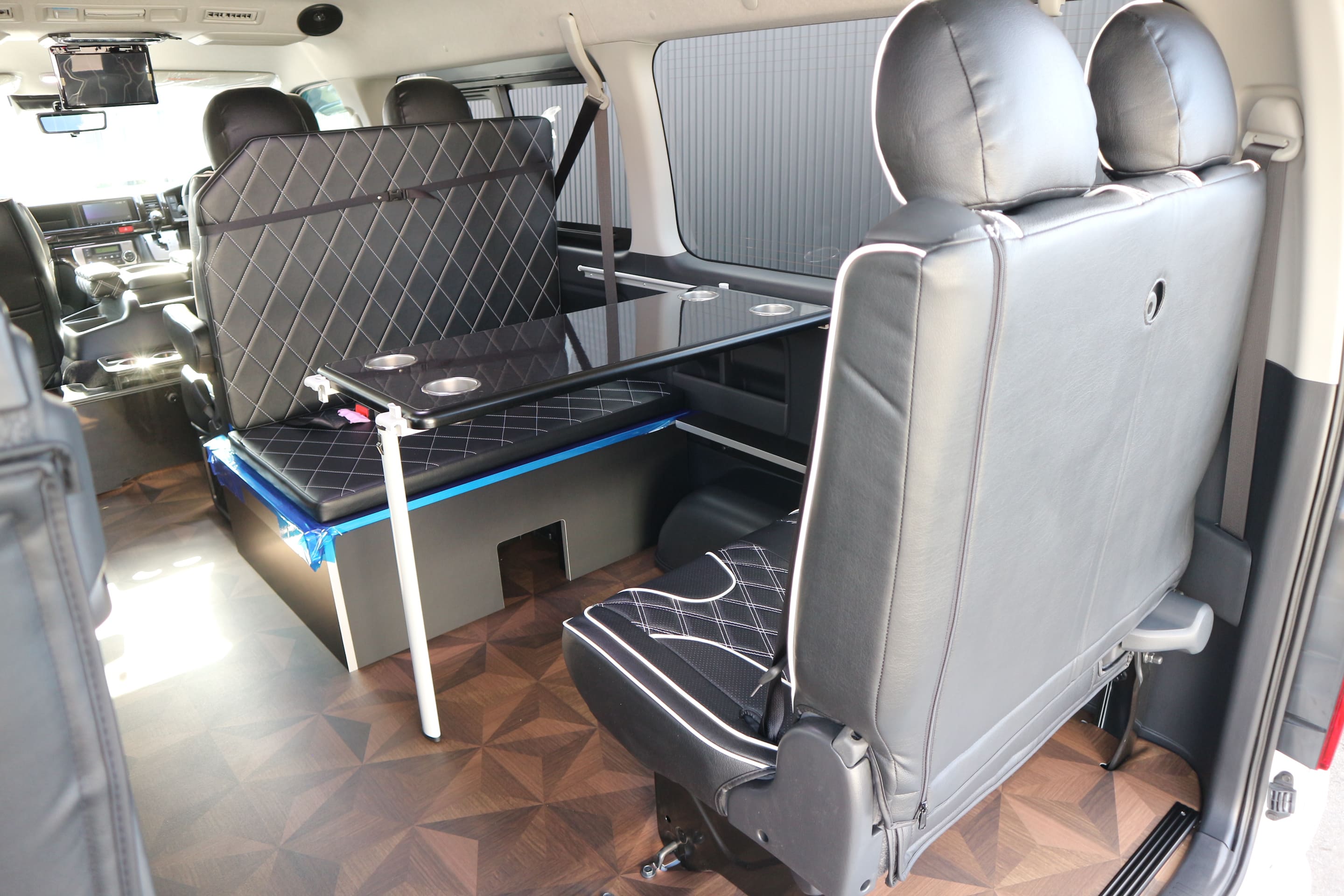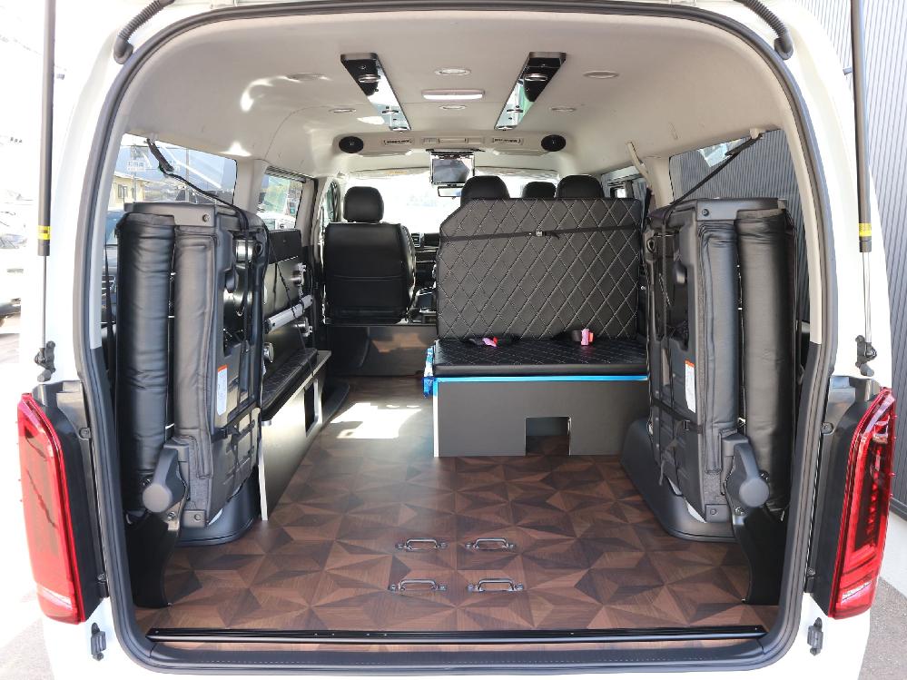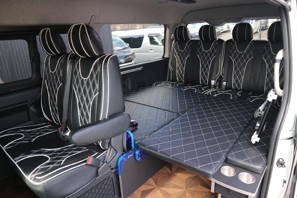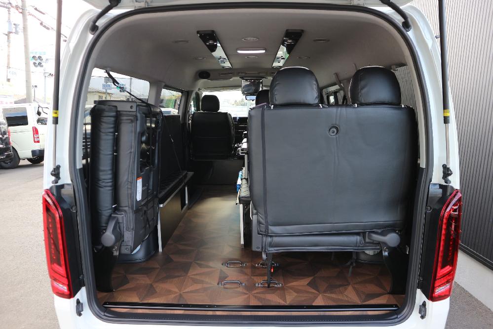 HOME > ギャラリー:IF-WB8 : ハイエースワゴンGL前向き8名後ろ向き2名10人乗り対面ラウンジベット家具 > IF-WB8 200系ハイエースワゴンGL ワイドボディー 前向き8名後ろ向き2名10人乗り対面ラウンジベッド家具施工