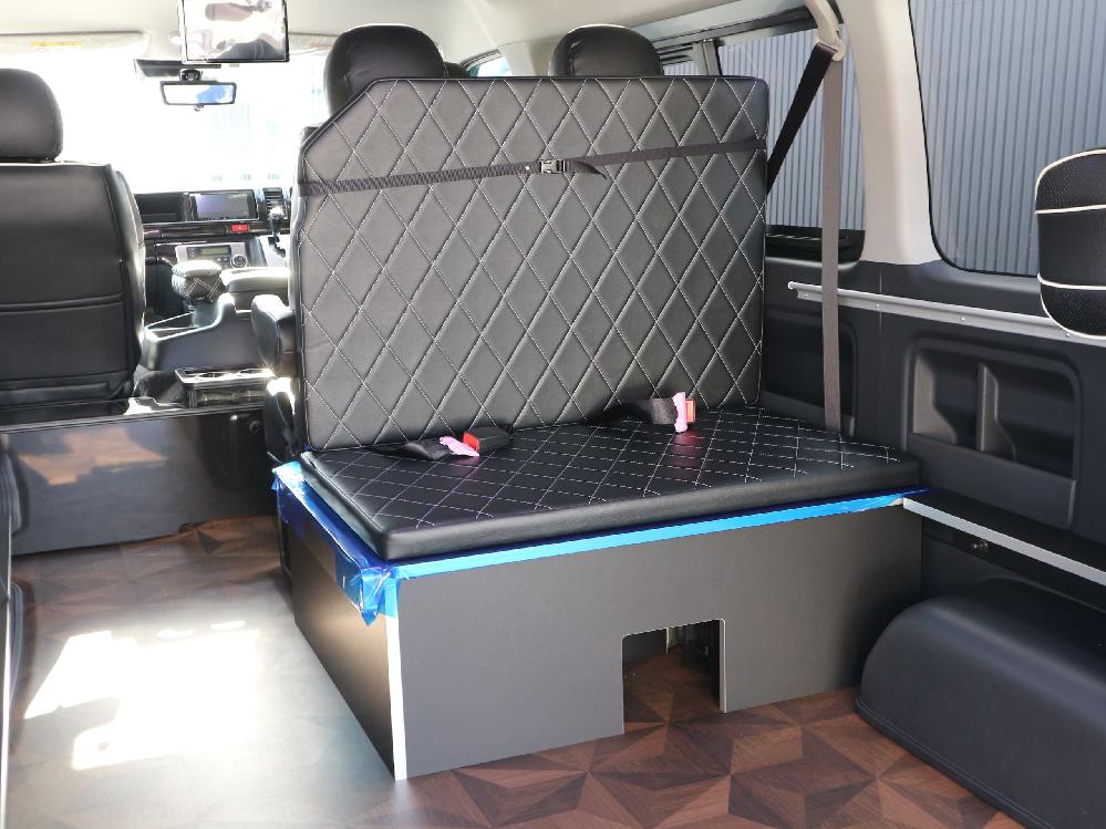 3列目後ろ向き2名シート展開 ベットマット背もたれ展開 後ろ向き専用シートベルト搭載