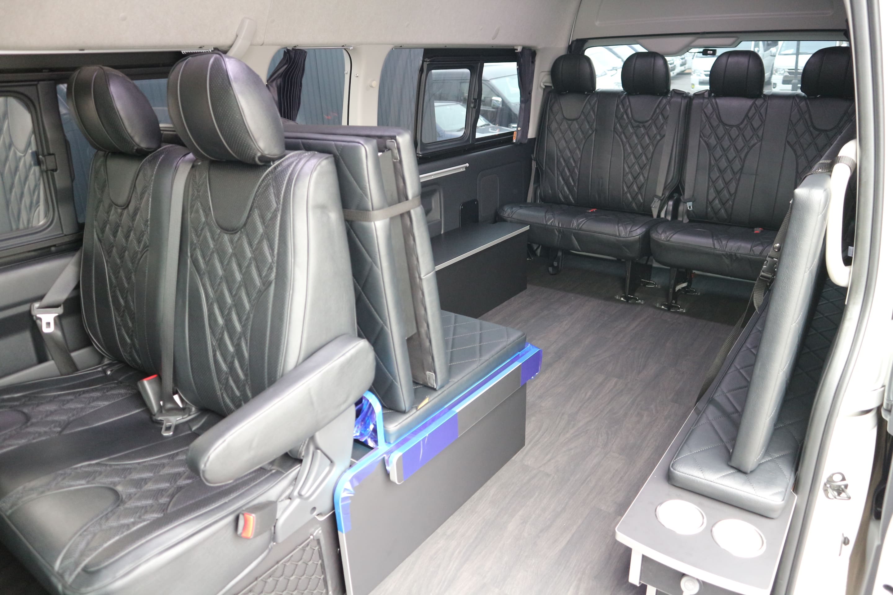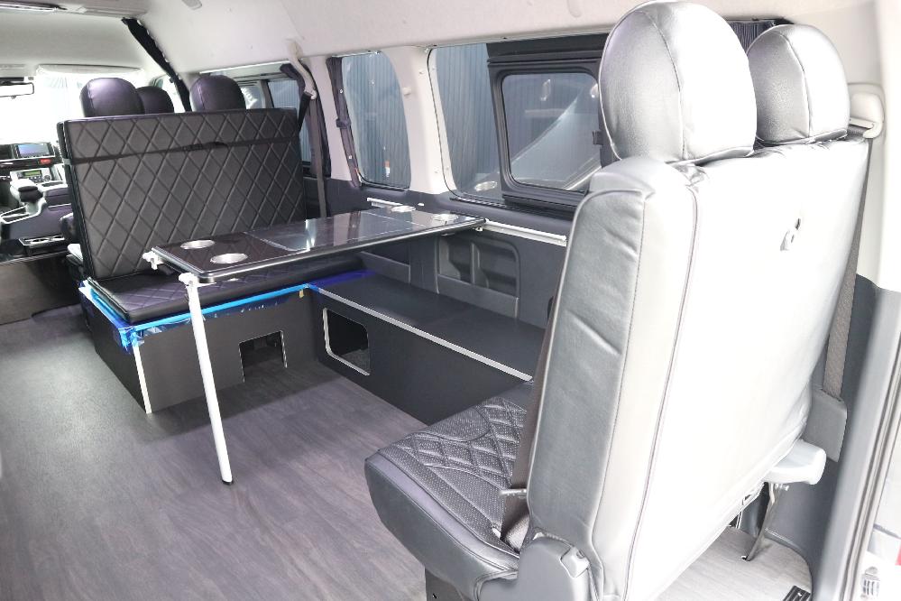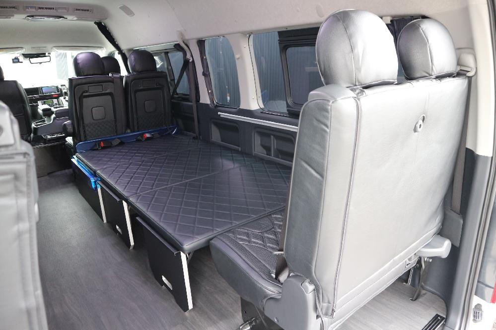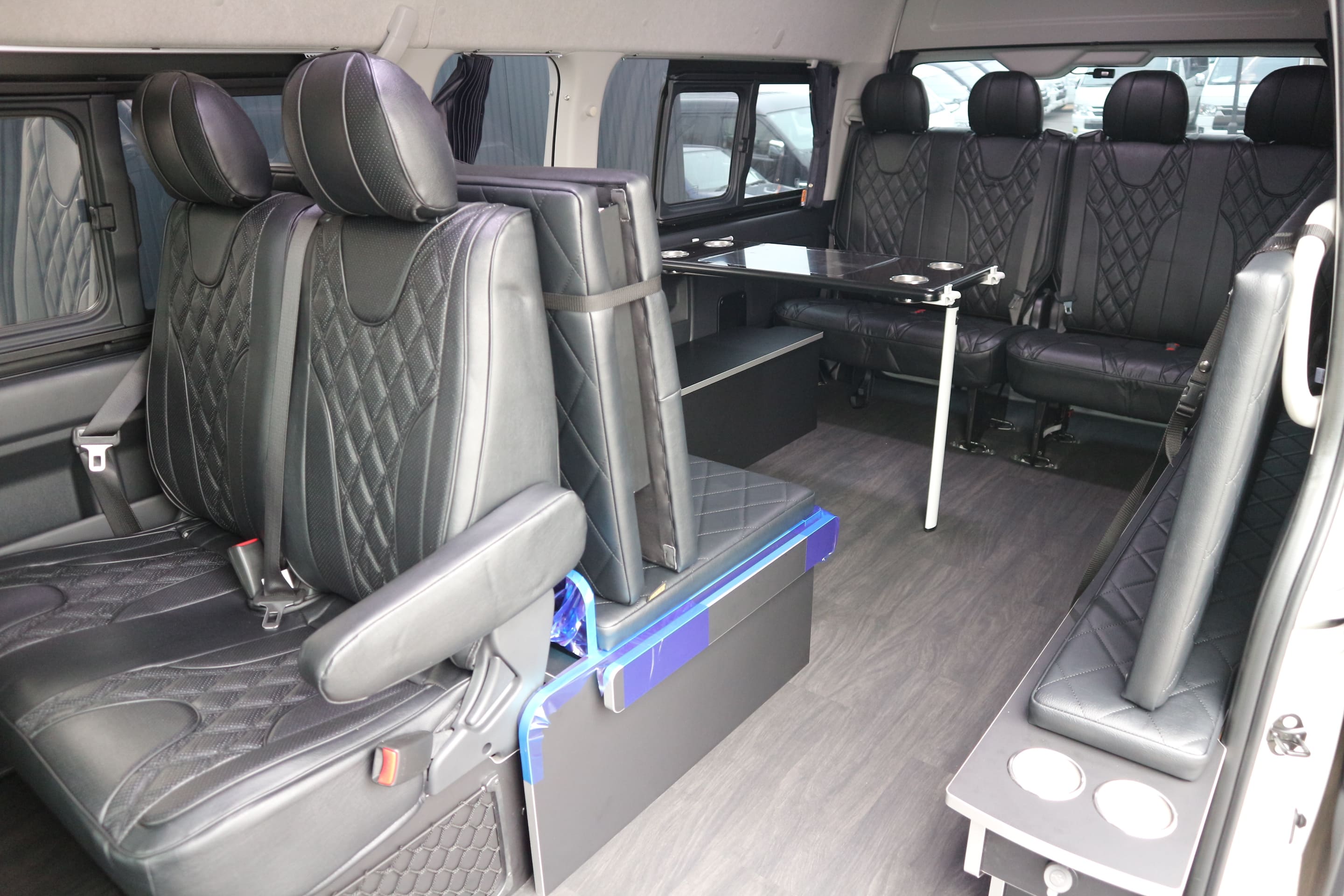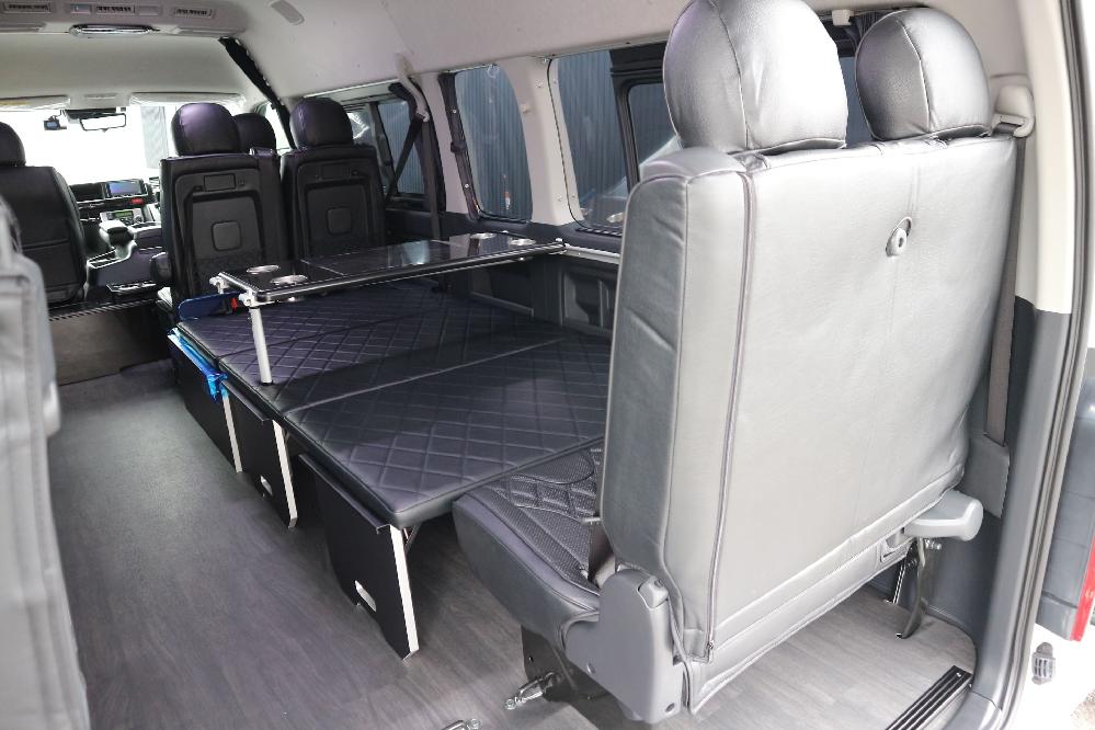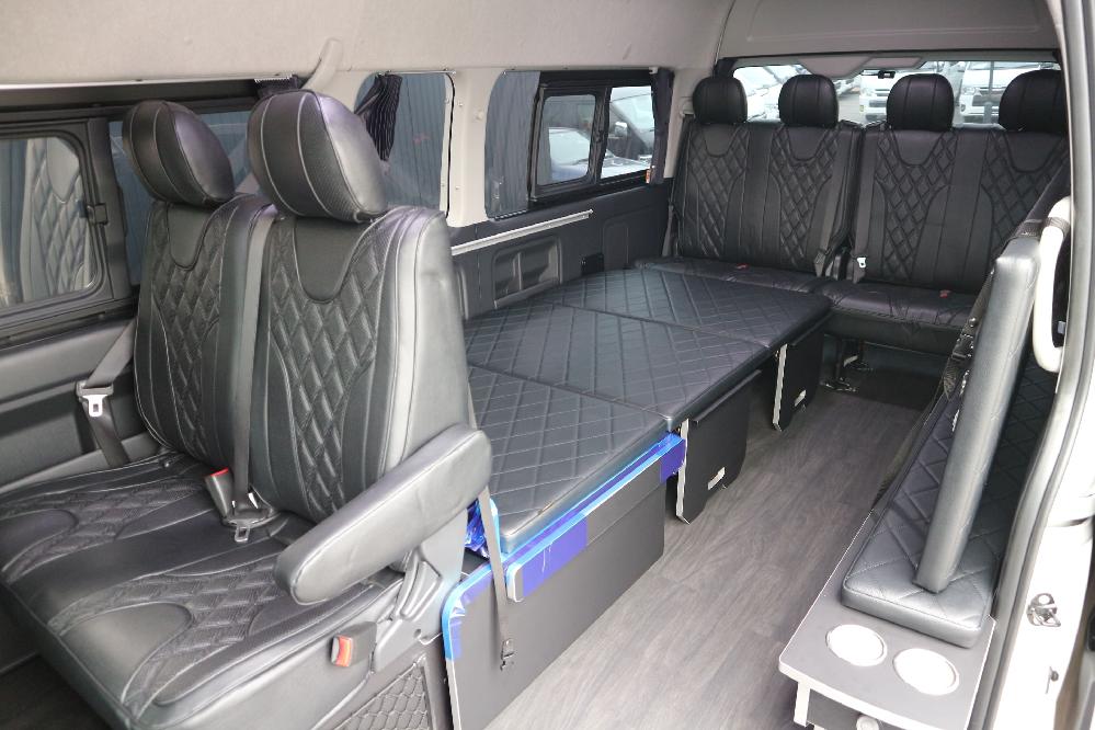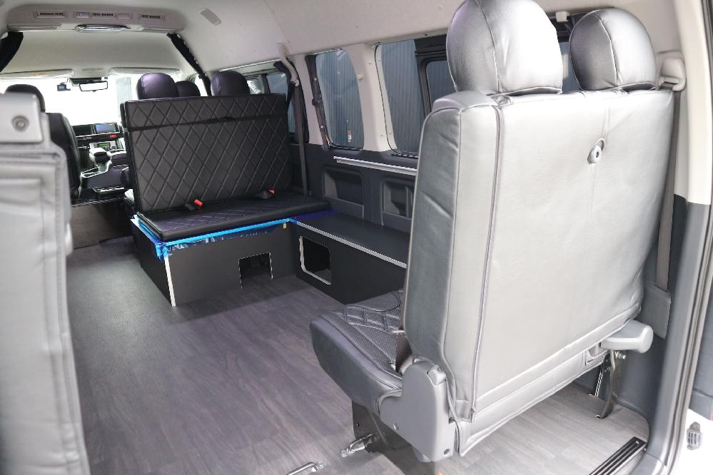 HOME > ギャラリー:IF-WB8 : ハイエースワゴンGL前向き8名後ろ向き2名10人乗り対面ラウンジベット家具 > IF-WB8 200系ハイエースコミューターGL スーパーロング 前向き8名後ろ向き2名10人乗り対面ラウンジベッド家具施工