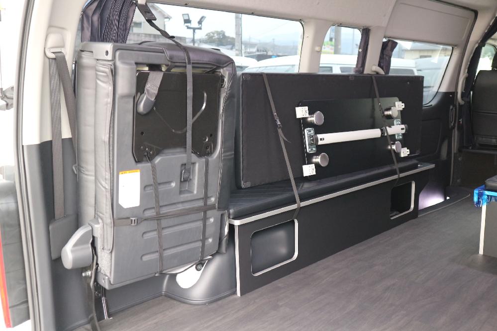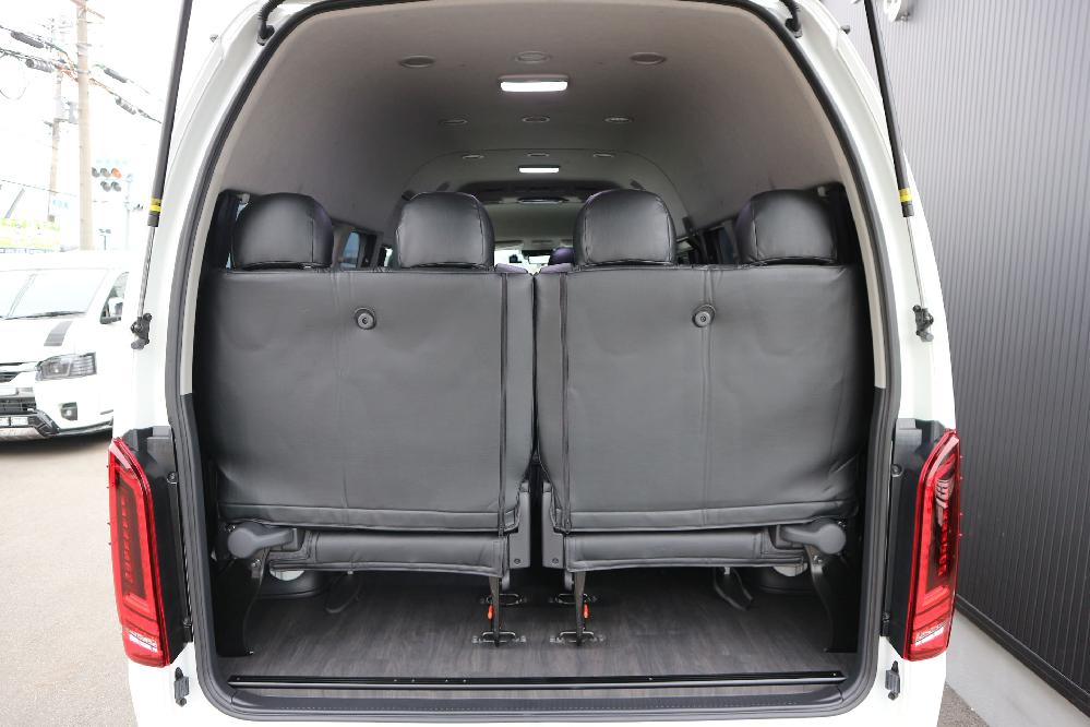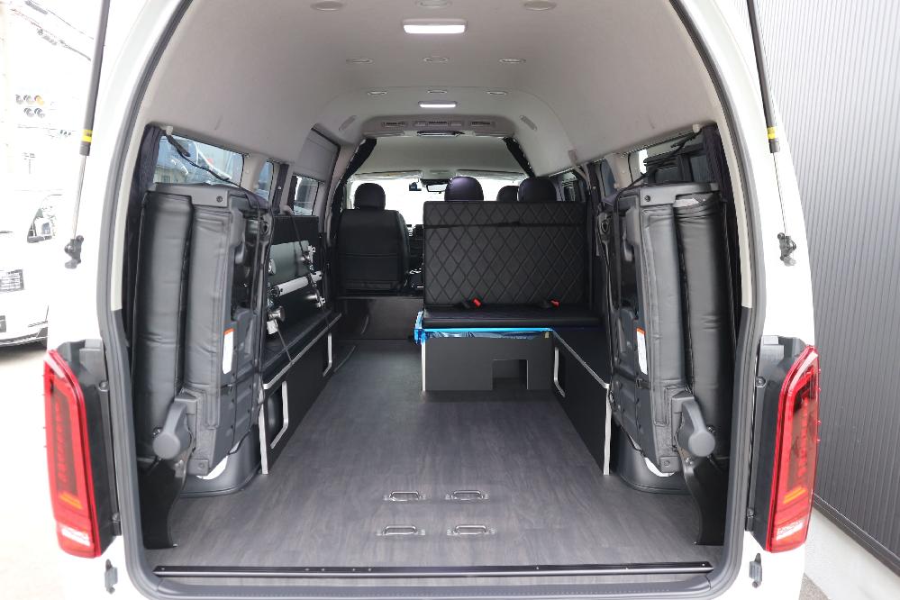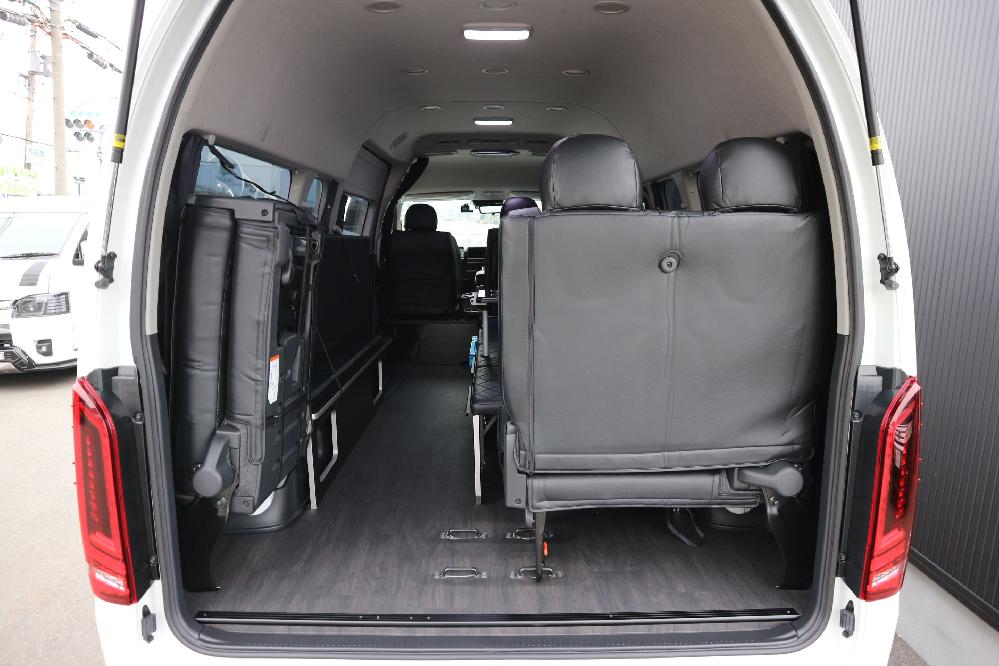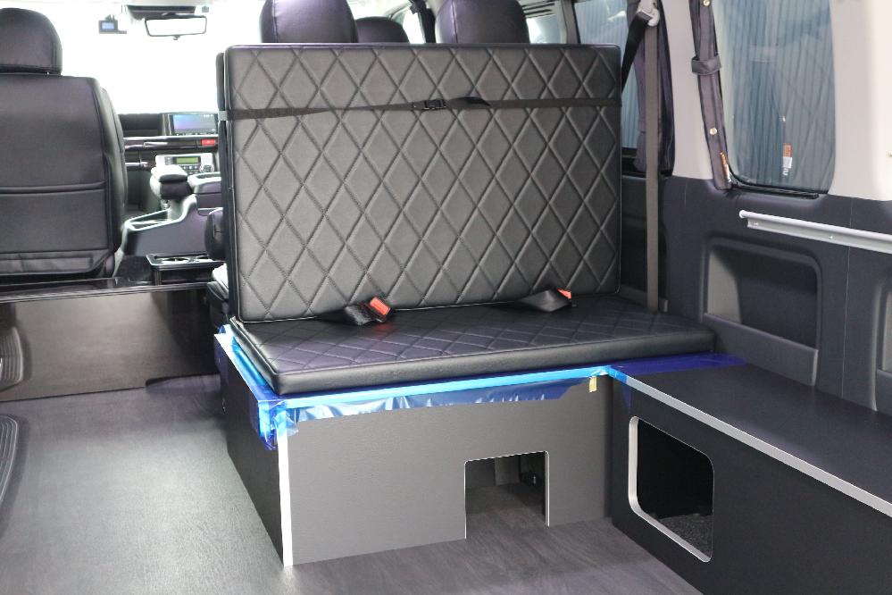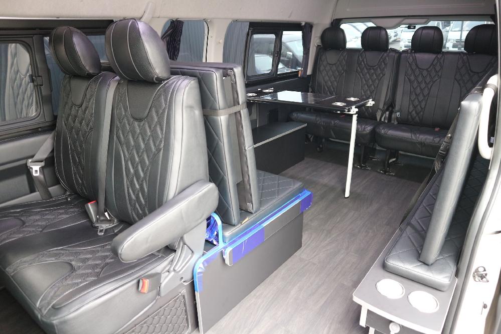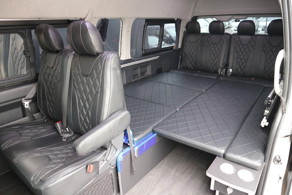 HOME > ギャラリー:IF-WB8 : ハイエースワゴンGL前向き8名後ろ向き2名10人乗り対面ラウンジベット家具 > IF-WB8 200系ハイエースコミューターGL スーパーロング 前向き8名後ろ向き2名10人乗り対面ラウンジベッド家具施工