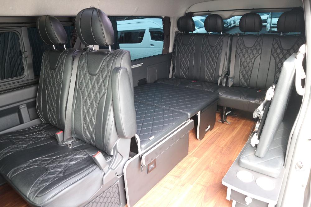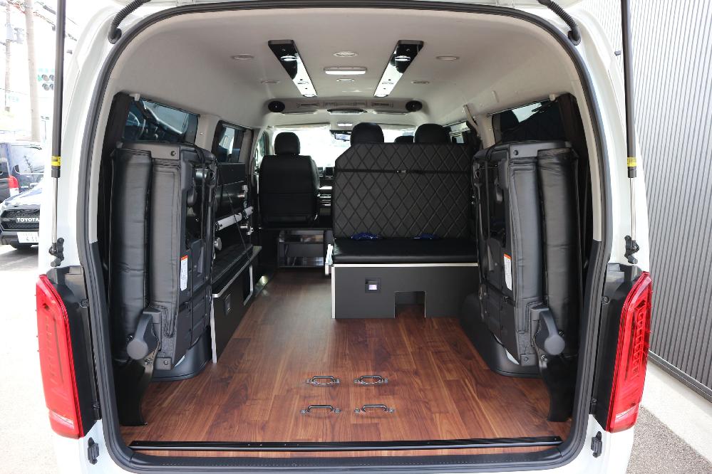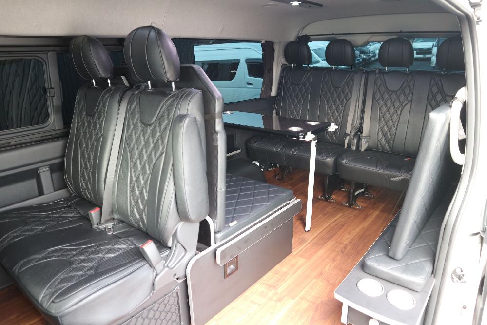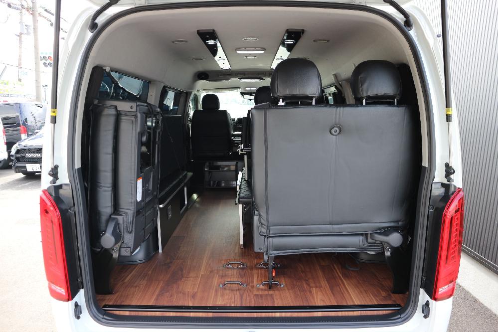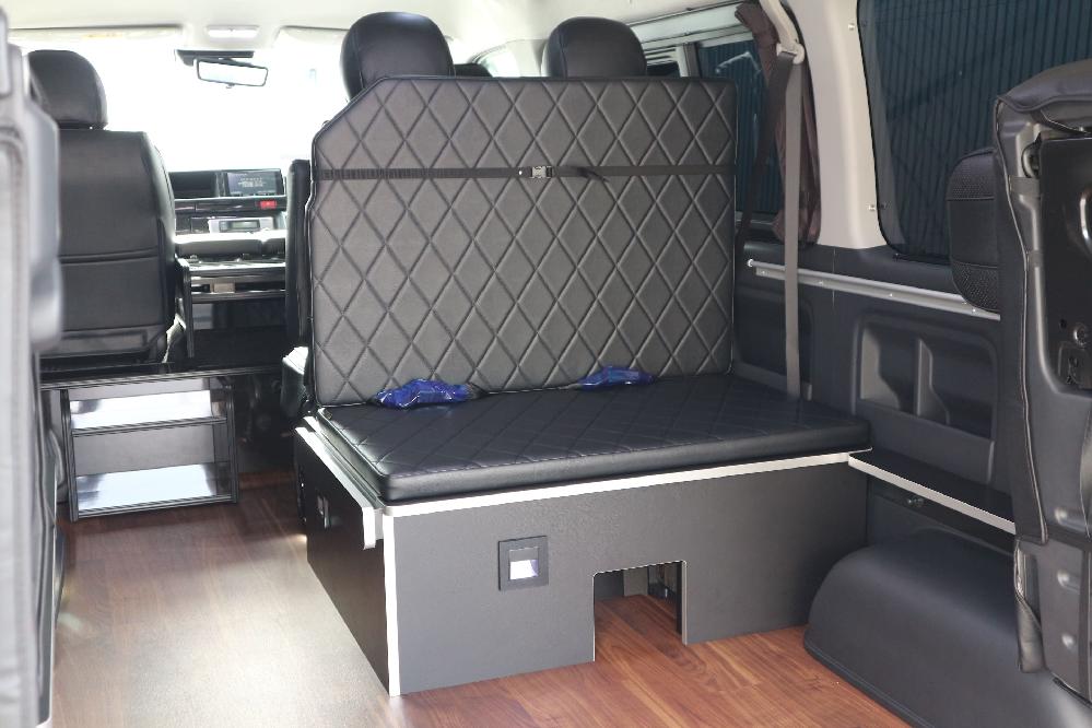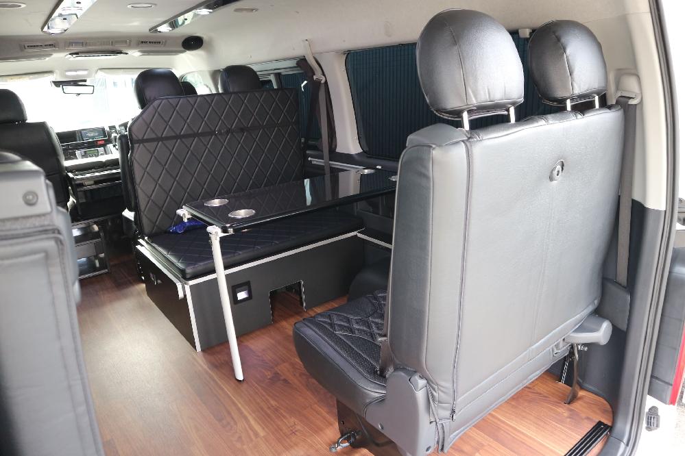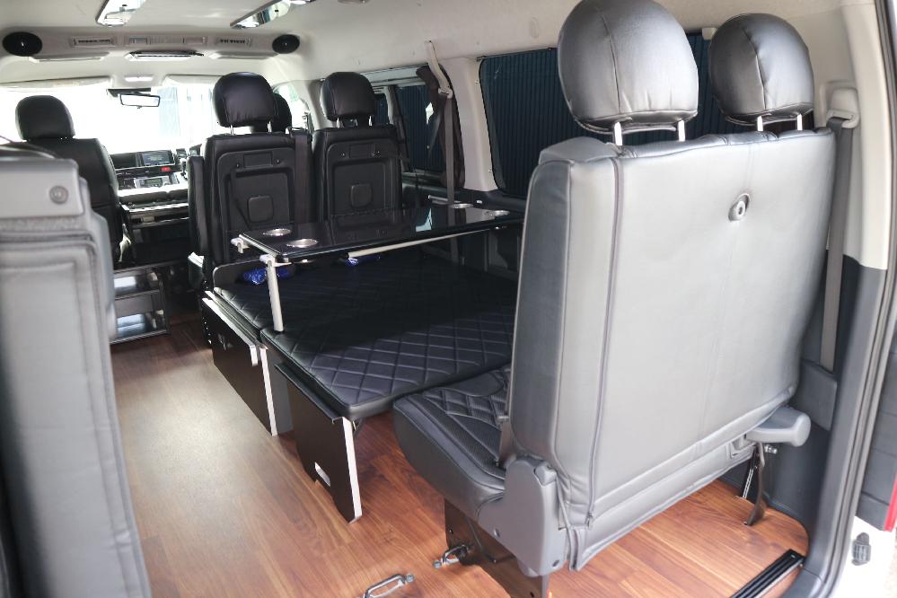 HOME > ギャラリー:IF-WB8 : ハイエースワゴンGL前向き8名後ろ向き2名10人乗り対面ラウンジベット家具 > IF-WB8リビングサルーン 200系ハイエースワゴンGL ワイドボディー 前向き8名後ろ向き2名10人乗り対面ラウンジベッド家具施工