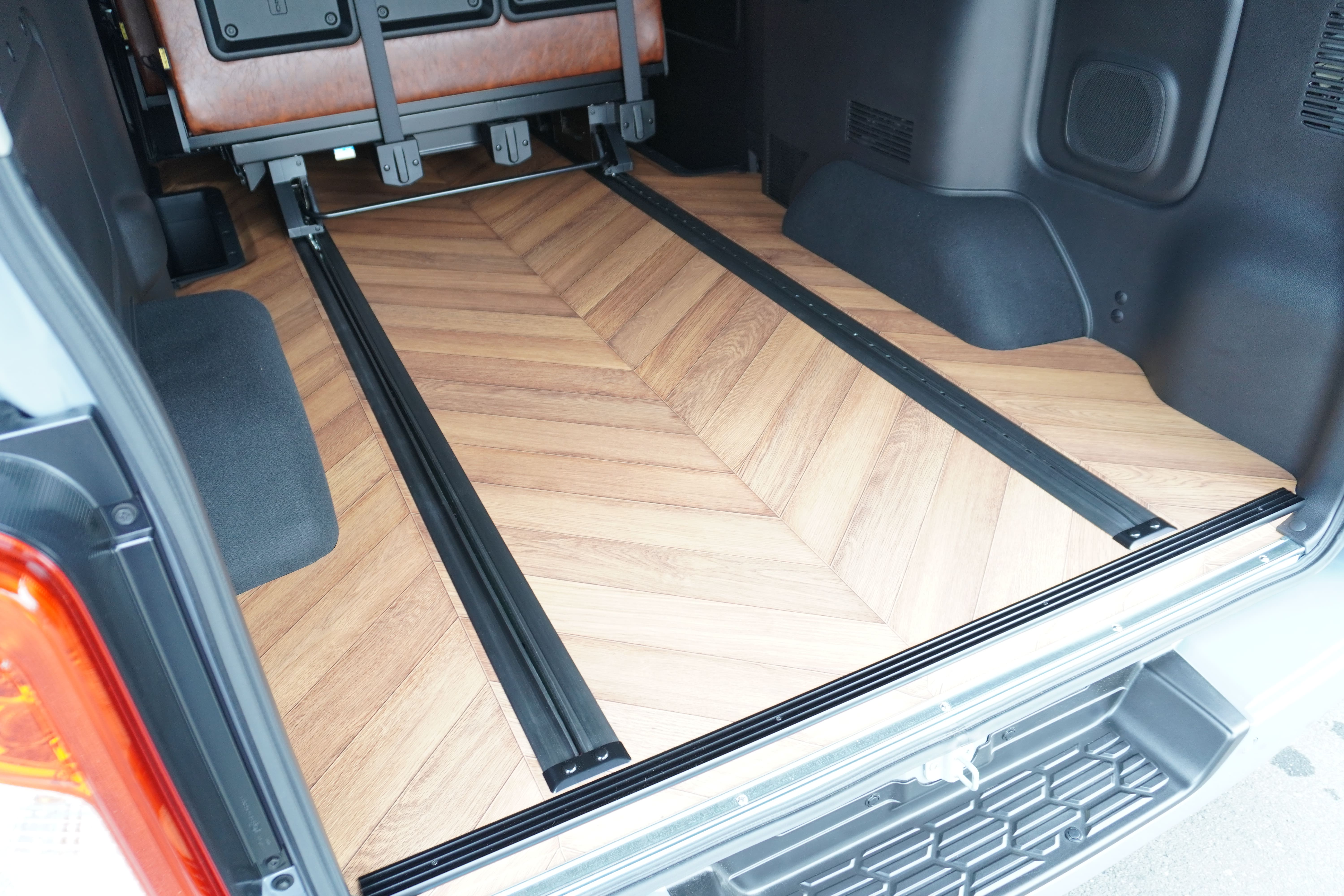 フロアフローリング施工(ヘリンボーン) ロングスライドレール スペアタイヤ取り出しできます フロアビス打ち無し