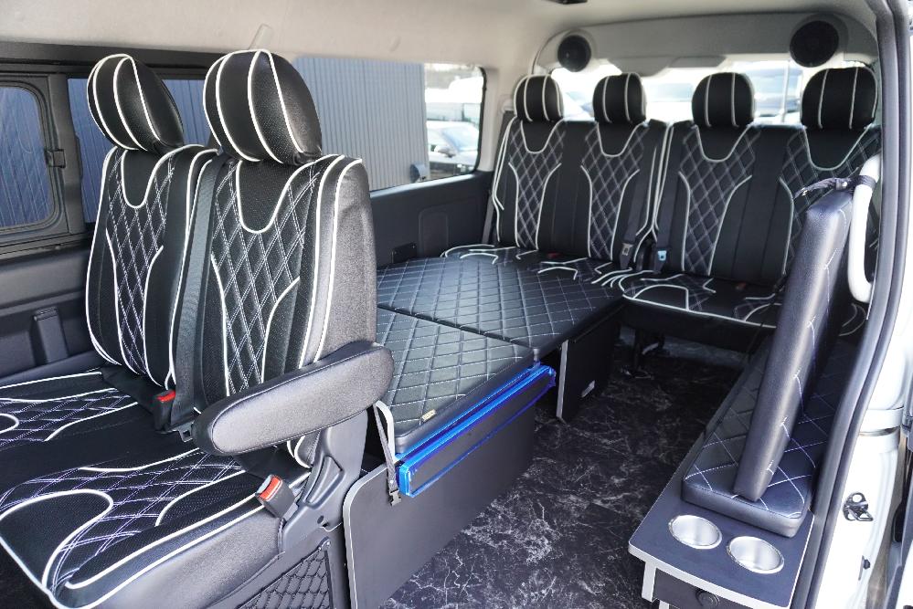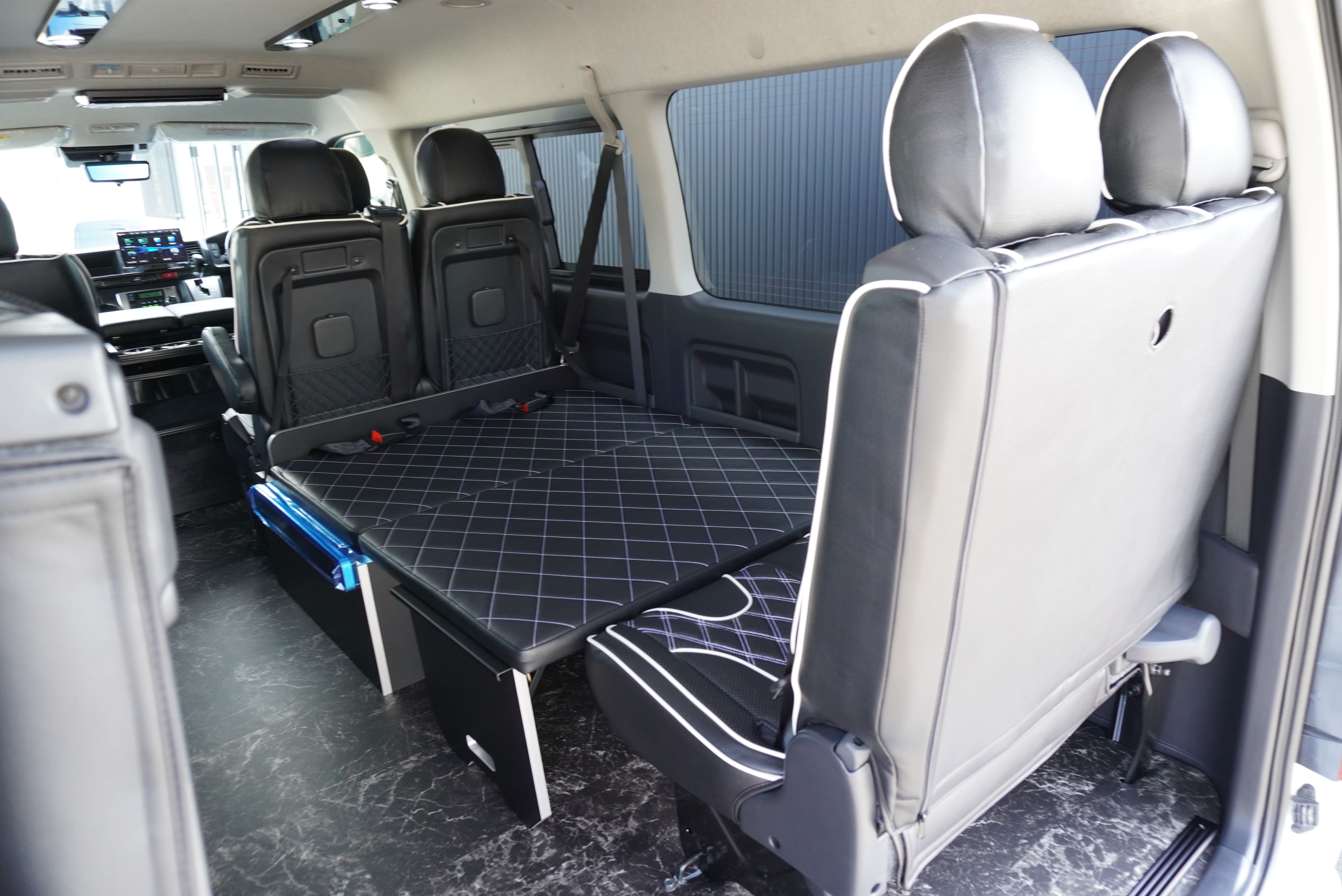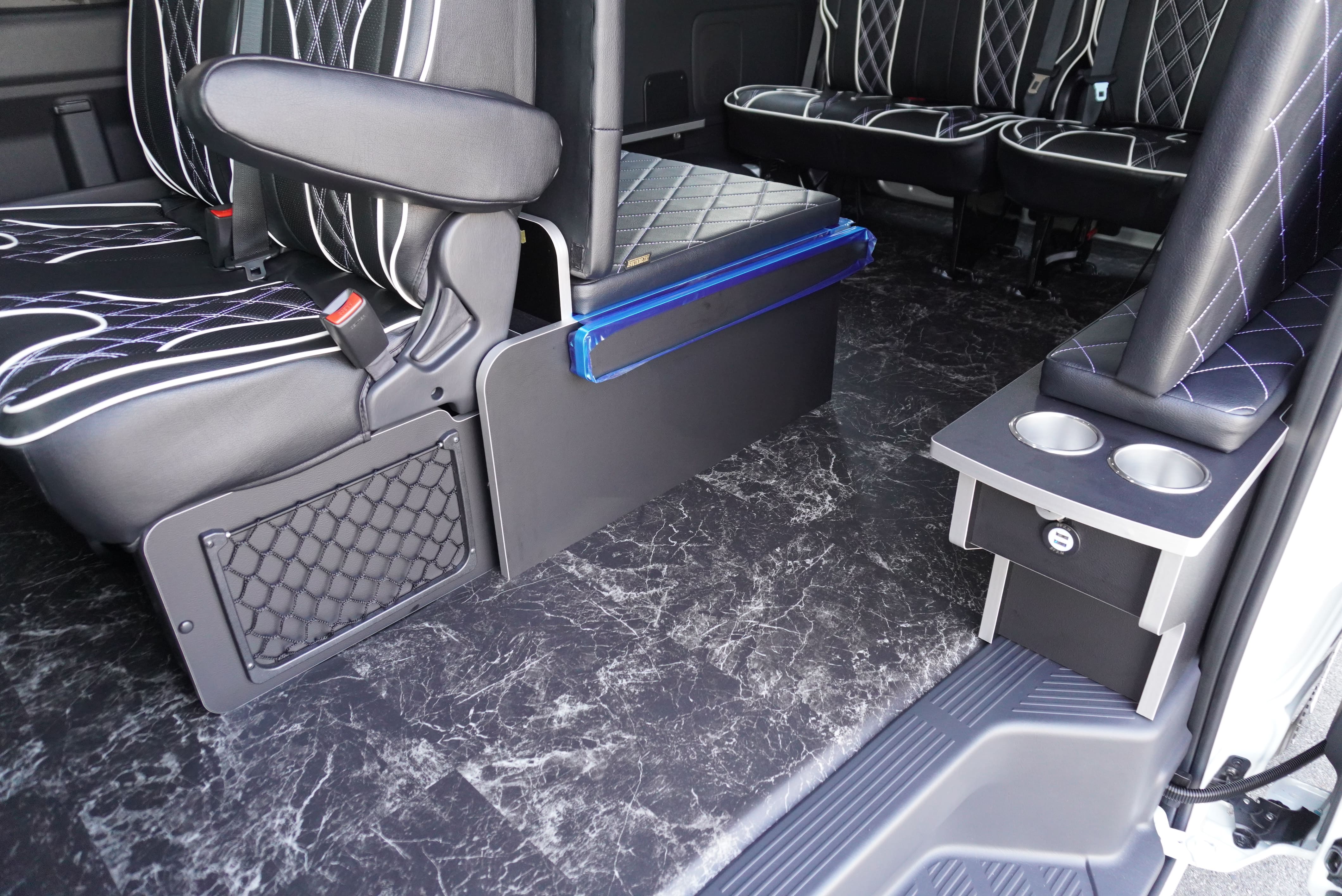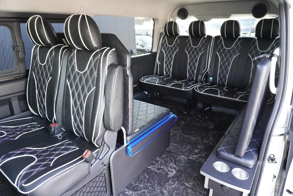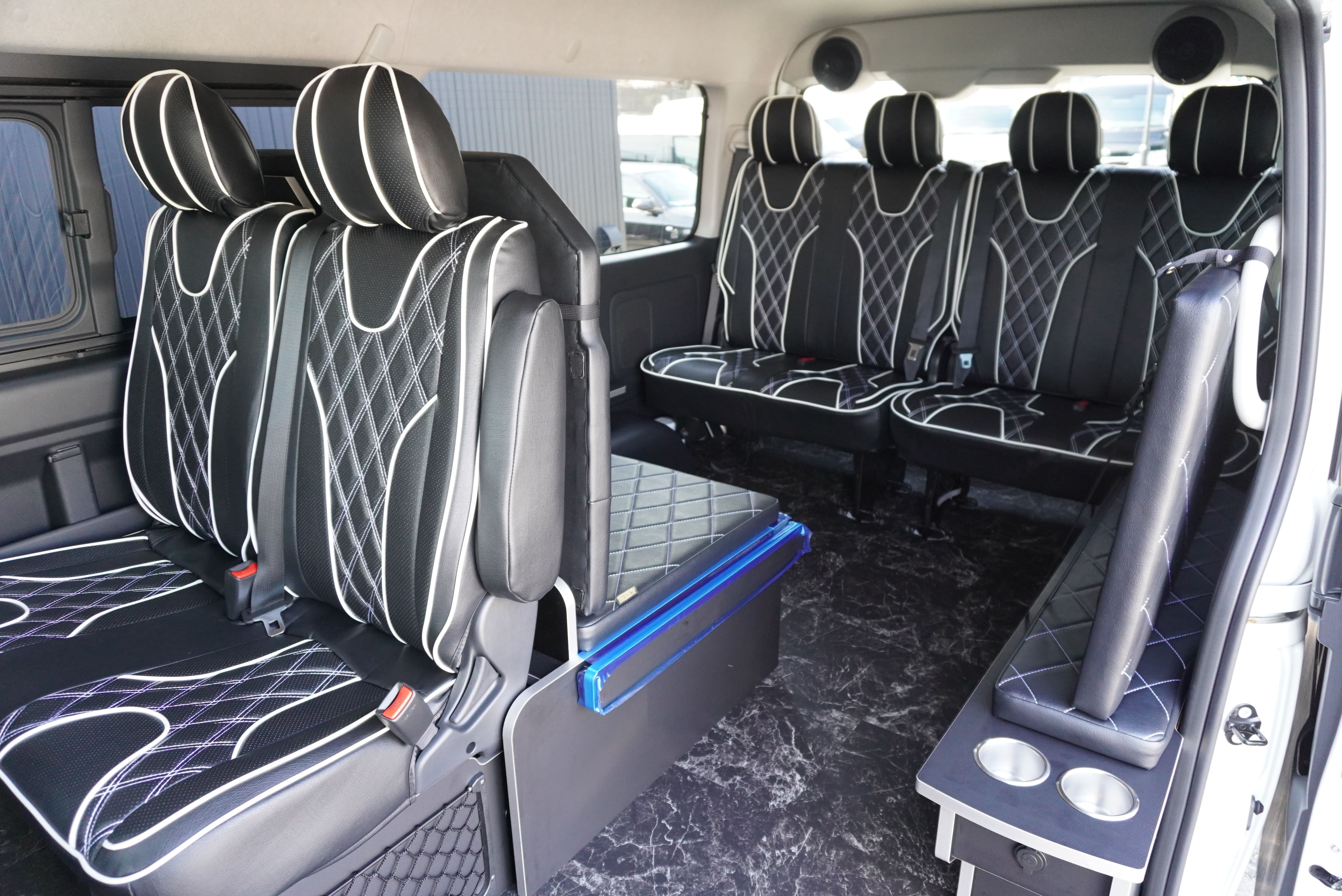 HOME > ギャラリー:IF-WB8 : ハイエースワゴンGL前向き8名後ろ向き2名10人乗り対面ラウンジベット家具 > IF-WB8 200系ハイエースワゴンGL ワイドボディー 前向き8名後ろ向き2名10人乗り対面ラウンジベッド家具施工