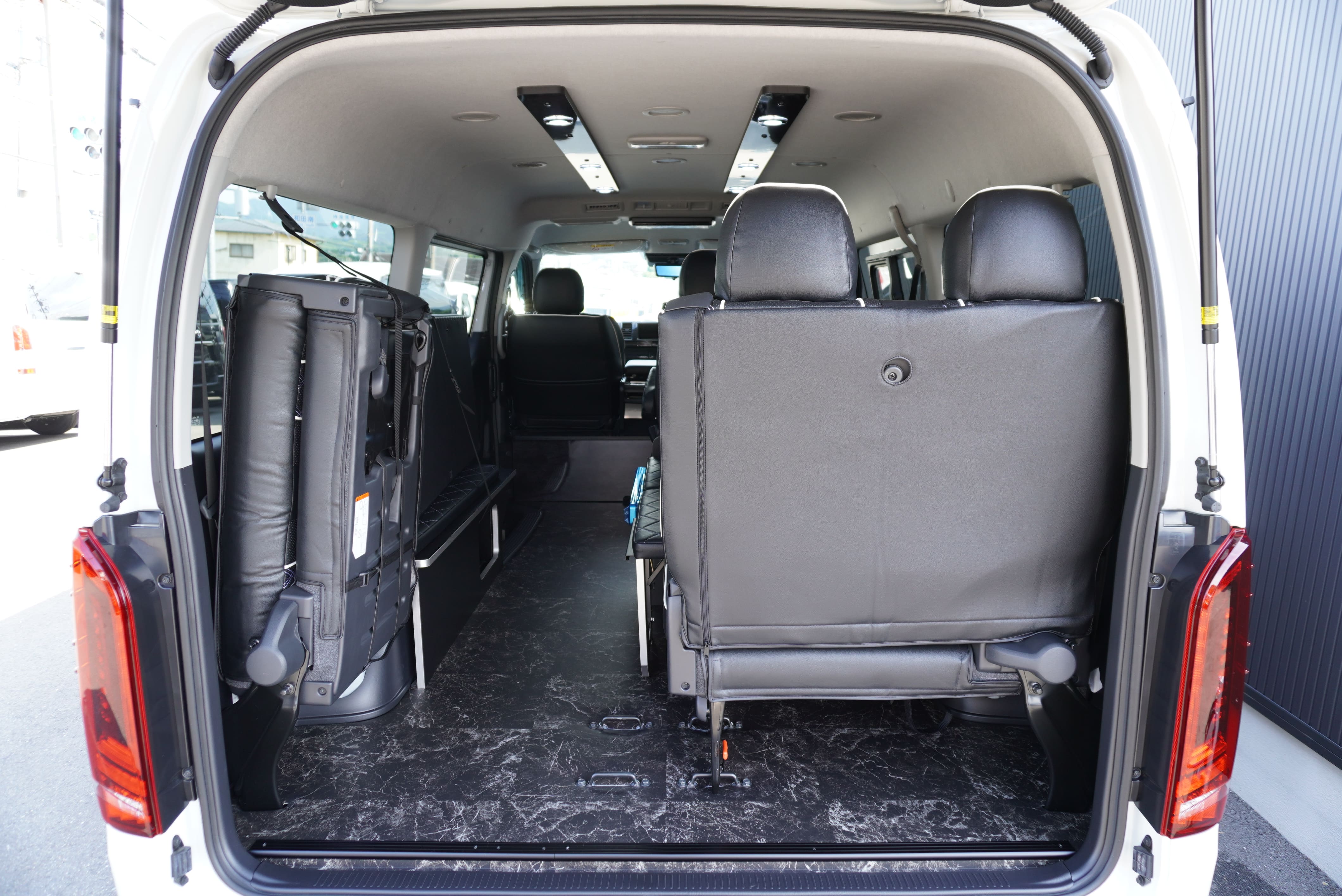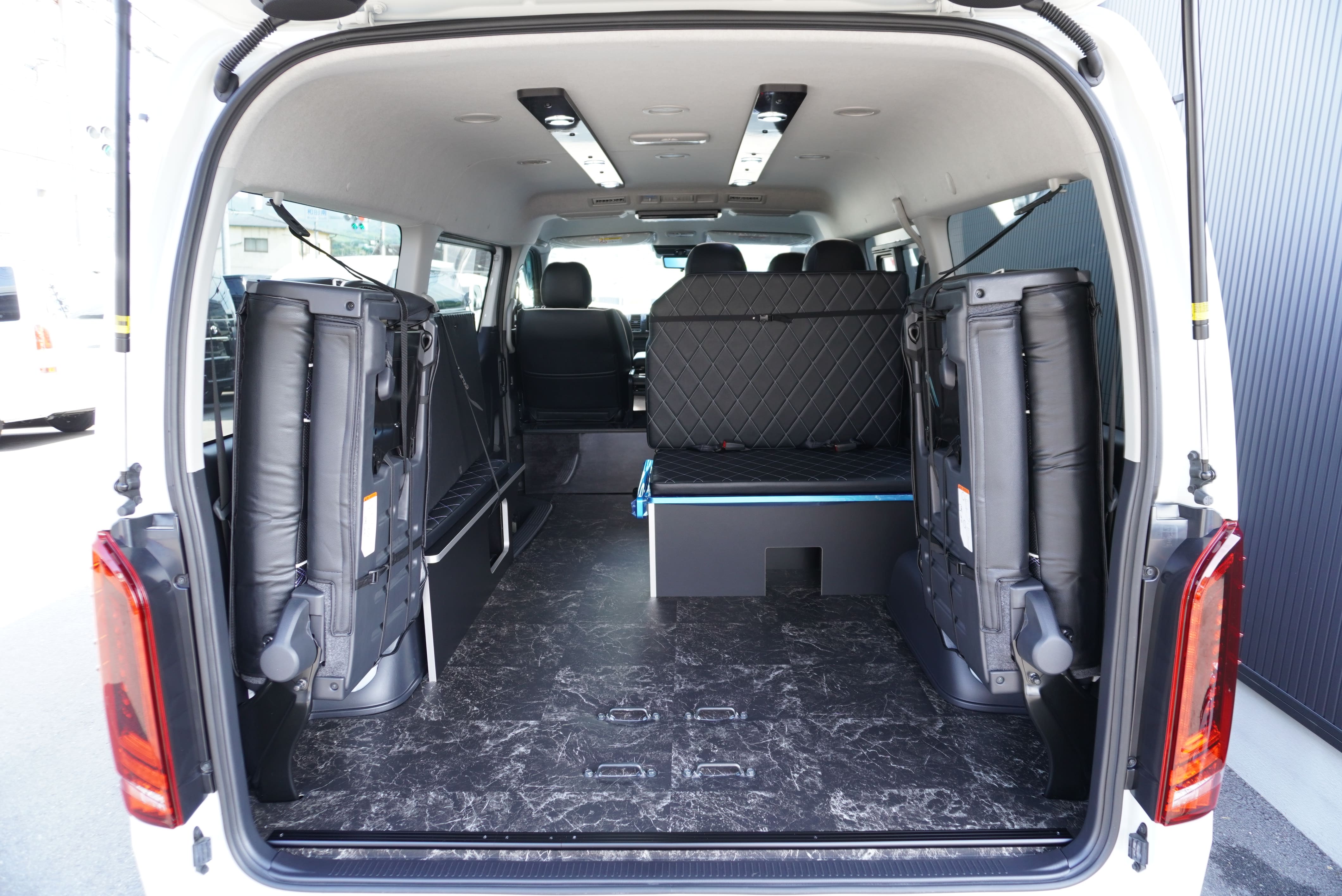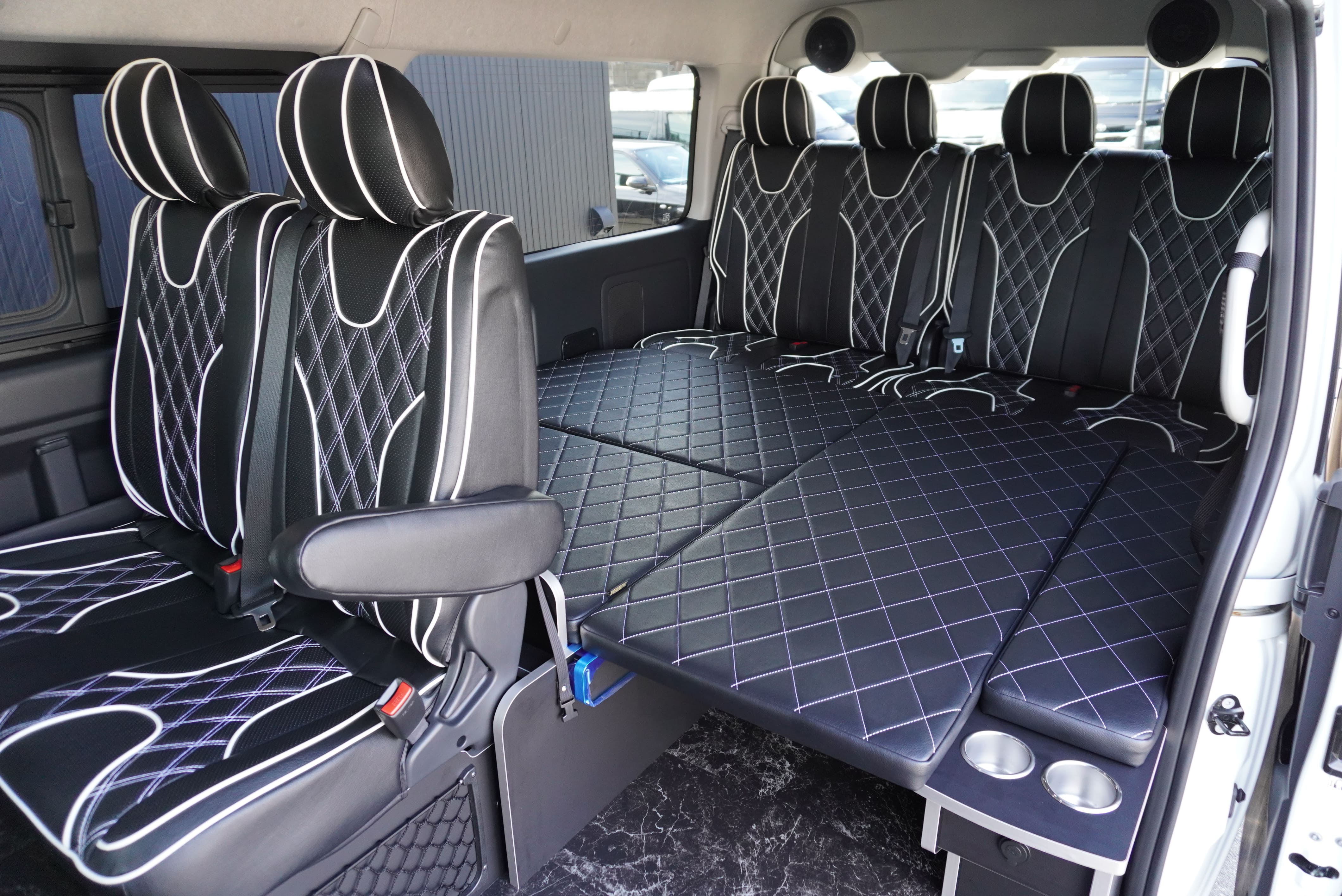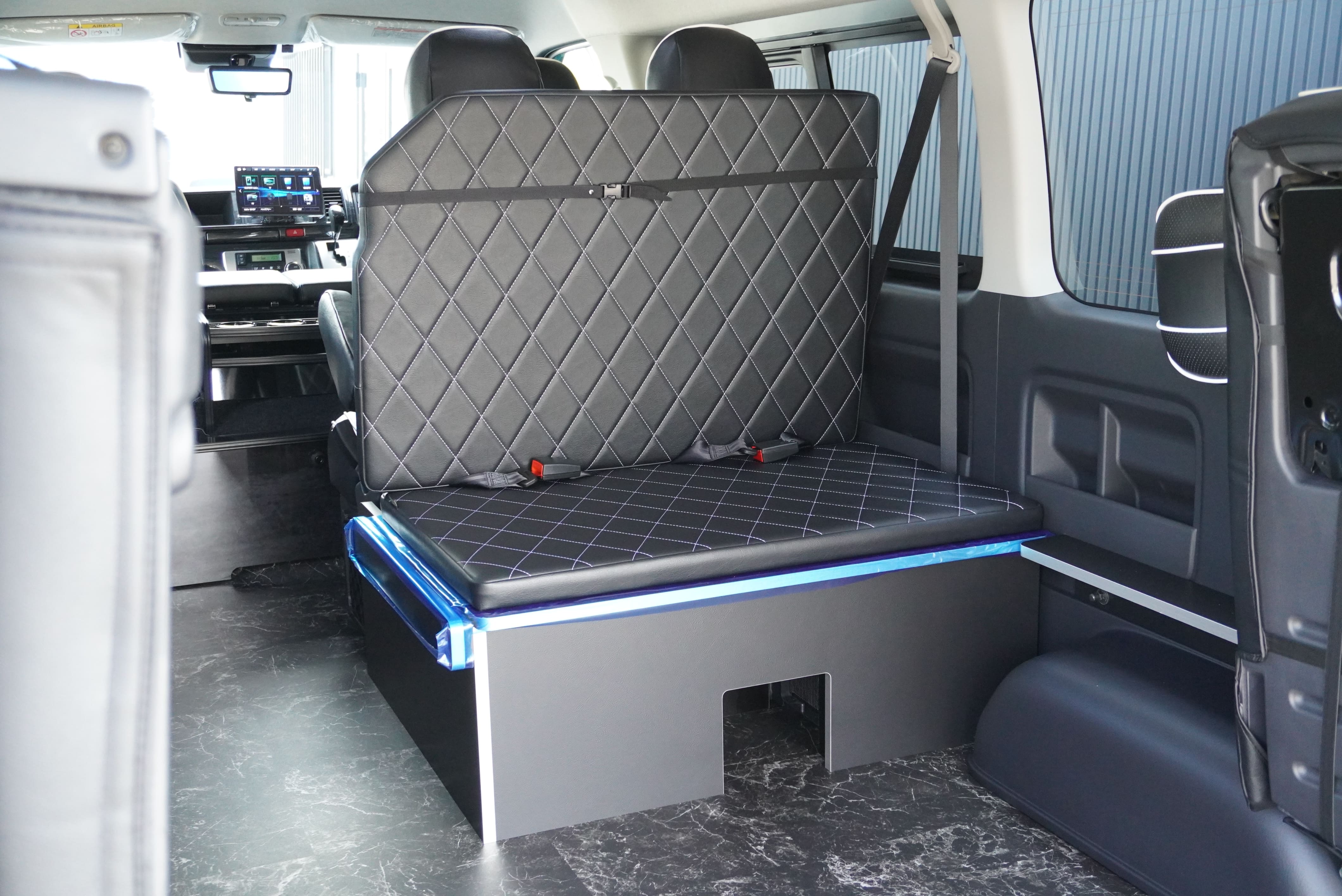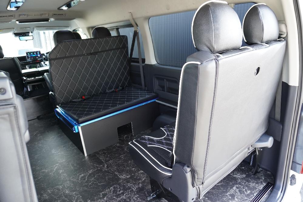HOME > ギャラリー:IF-WB8 : ハイエースワゴンGL前向き8名後ろ向き2名10人乗り対面ラウンジベット家具 > IF-WB8 200系ハイエースワゴンGL ワイドボディー 前向き8名後ろ向き2名10人乗り対面ラウンジベッド家具施工